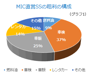 とは言え、SSの総経費を油外収益で安定的にカバーできる体質づくりが果たせたのは、昨年の大きな収穫です。 その油外収益は7.2億円でした。総粗利の9割を油外が占め、油外の8割は「車検」「車販」「レンタカー」です(グラフ1)。当社にとっては、これが「三種の神器」です。