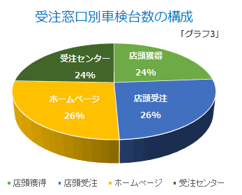 車検の受注窓口は、店頭、ホームページ、受注センターの3つがあり、店頭はさらに能動的に「獲得」する方法と受動的に「受注」する方法の2パターンがあります。「グラフ3」に見る通り受注台数の現状はどの窓口もほぼ同数で、どれも欠かすことはできません。