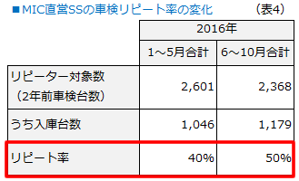 前述の「受注センター」の機能も統合し、昨年8月には広い事務所スペースをあてがいました。 その甲斐あってか、車検のリピート率は40%から50%にまで上昇し(表4)、前年割れを起こしていた車検台数も下半期から巻き返しているのです。