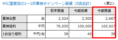 「1~3月の車検入庫目標2,500台、1億円を獲得しよう」と3カ月間のキャンペーン目標を掲げていました。実績は入庫2,667台、粗利1億90万円となり、何とかクリアできました(表2)。