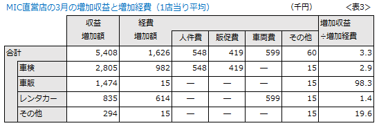 表3は、3月の費目別の経費増加額と、得られた収益増加額をまとめたものです。