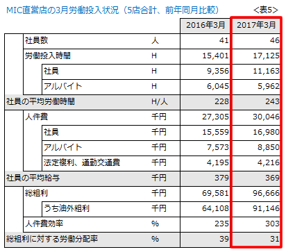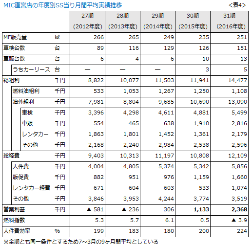 SS業界には、人件費の何割を油外収益で賄っているか、いわゆる「人件費効率」という指標があります。かつては、当社も100%を目指したものですが、いつの間にやら200%を超え、この3月は、なんと300%を記録しました(表5)。