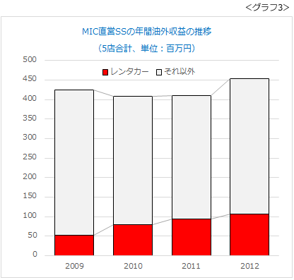 その結果、当社のレンタカー売り上げが年間1億円を突破したのは前述のとおりです。さぞかしSSの利益が改善したのだろう。否。実はほとんど変わりませんでした。レンタカーの収益が伸びた分、他の収益が減少してしまったのです(グラフ3)。