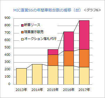 さて、昨年は当社SSの車販の中核である「個人向けオートリース」の取り扱いの方法論がほぼ確立し開花しました。この5年間で累計2,570台を販売しています(グラフ6) 。