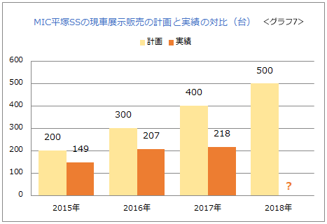 ところで、グラフ6を見ると、オートリースだけでなく現車販売も伸びています。車販台数の 25%を占めます。 古くなったレンタカーを販売したりもしていますが、これは主に平塚店に中古車展示場を増設したことによるものです。一般の中古車屋さんのようにオークションから中古車を仕入れ、 店頭に並べ、集客して販売するというスタイルです。 3年間やってきましたが、実はこれも「頭痛の種」のひとつです。 計画を大きく下回っており、いまだ低迷しているのです(グラフ7) 。