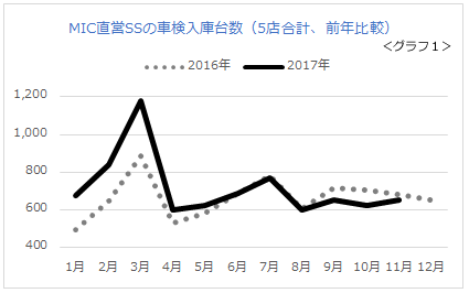 グラフ2の点線は、2016年の月別車検需要を100とした場合の、2017年の需要の変化です。