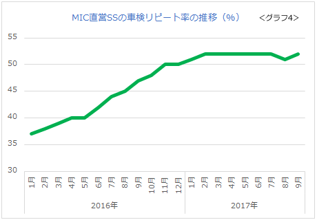 一方、当社SSの入庫台数は 同グラフ2の実線です。1月、2月は前年比130%と調子が良かったのですが、3月にトーンダウンし、5~7月は前年並み。8月以降は前年割れとなりました。