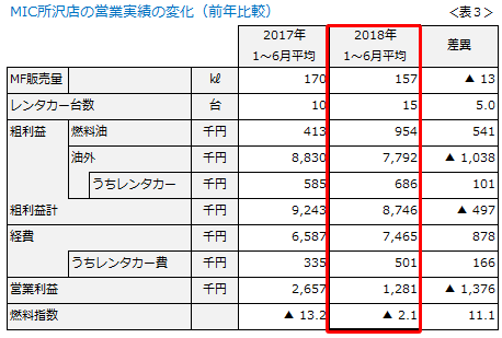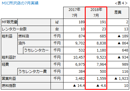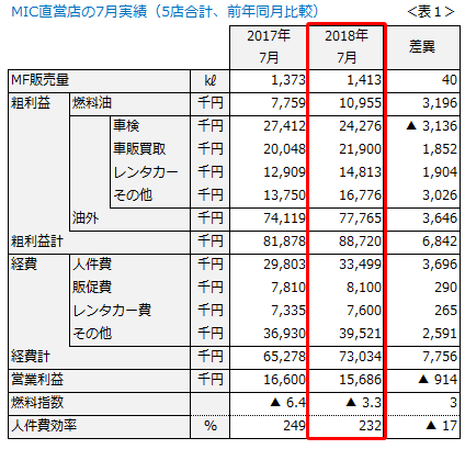 さて、表1は当社SSの7月実績です(5店合計)。7月は当社にとって期首にあたり、華々しいスタートを期待していましたが、残念ながら燃料指数を3ポイント落としてしまいました。