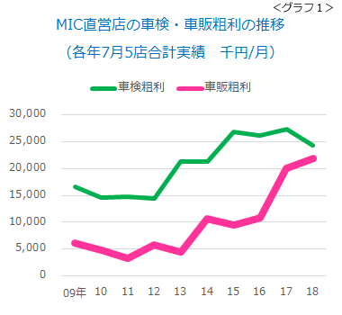 油外商品で気を吐いているのは「車販」です。2015年に新車リースを取り扱いブレイクしました。今年7月は前年比180万円アップ。伸び悩んでいる「車検」に肉薄してきました(グラフ1)。