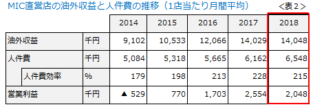 ところが今年に入り、突然目に見えない壁にぶつかったようです。油外収益の伸びが減速しているのです。人を投入しても油外販売は伸びない。増えた人件費が利益を圧迫するだけになっています(表2)。