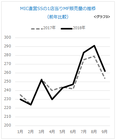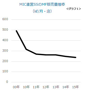 当社のSSもかつては、1店舗当たり500kl/月を販売していたのですが、わずか5年で見事に半減しました(グラフ1)。