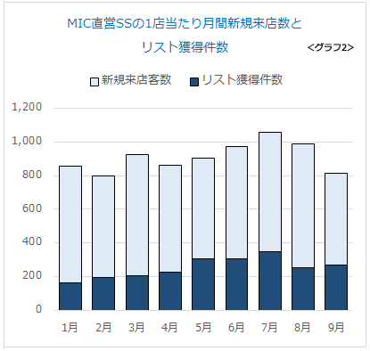 新規客は現在も月間800件以上来店していますし(グラフ2)、これに7月から積極的にアプローチしてリストを獲得した結果、減販が止まり、増販に転じたのです(グラフ3) 。