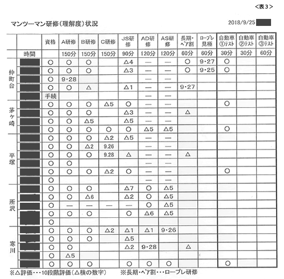 表3は、O君がつけている個人別理解度状況です。25人の車販担当者がいますが、〇印は完了した研修、△印は研修途上のものを10段階レベルで示しています。