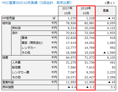 10月は、当社SSの営業利益は横ばいでした(表1)。