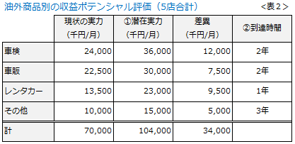 それぞれの油外商品が、①あとどれくらい伸びるか(潜在実力)、②どれくらい時間をかければ伸びるか(到達時間)を表2に整理してみました。