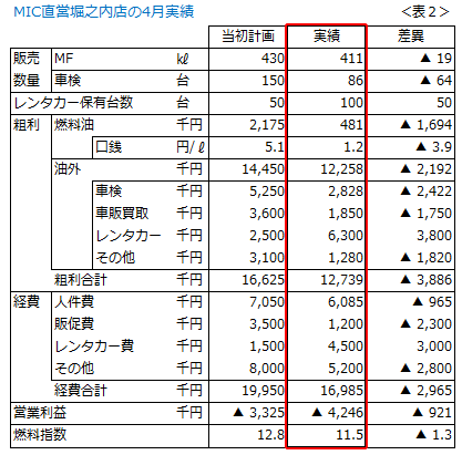 3月は車検とレンタカーの需要獲得に成功し、「オープン5カ月目に黒字!」とお伝えしましたが、やはり4月は馬脚を現しました(表2)。もっとも、これは想定内の事態です。