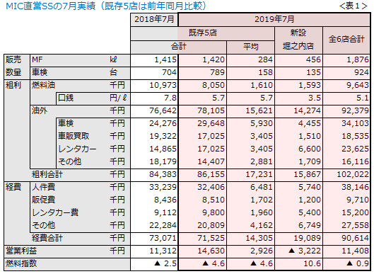 当社の直営SSの8月実績を示します。既存5店の営業利益は、前年は1,000万円でしたが、今期は2,900万円となりました。3倍増です。 さらに、昨秋に新設した堀之内店(東京都八王子市)も330万円の黒字を出しました(表1)。