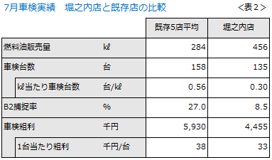 表1は、既存5店と堀之内店の車検実績の比較です。