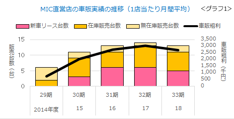車販収益の伸びが止まっているのも、気になります。 新商品「新車リース」を投入して以来、車販は伸び続け、1店当たり月間平均300万円に達しました(グラフ1)。