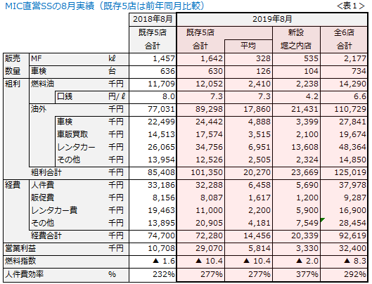 当社の直営SSの8月実績を示します。既存5店の営業利益は、前年は1,000万円でしたが、今期は2,900万円となりました。3倍増です。 さらに、昨秋に新設した堀之内店(東京都八王子市)も330万円の黒字を出しました(表1)。