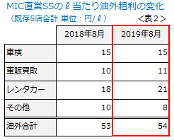 表2は、8月のL当たり油外粗利の変化を示したものです。ほとんど変わっていません。