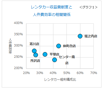グラフ1は、当社直営店の8月の「レンタカー収益貢献度(ヨコ軸)」と「人件費効率(タテ軸)」を、プロット(描画)したものです。相関関係が大きいことが分かります。