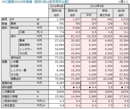 当社直営SSの9月の実績を表1に示します。