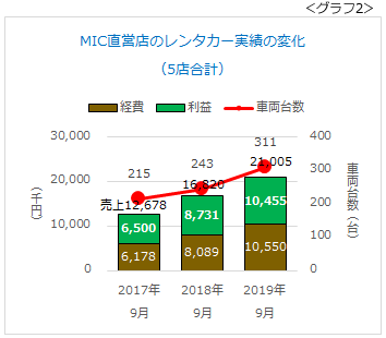 グラフ2は、当社直営店の9月実績の推移です。レンタカーだけで1,000万円の営業利益(5店合計)を出せるようになりました。