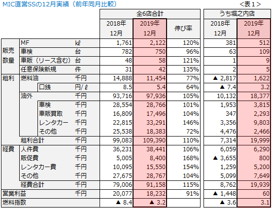 表1は、2019年12月の実績です。
