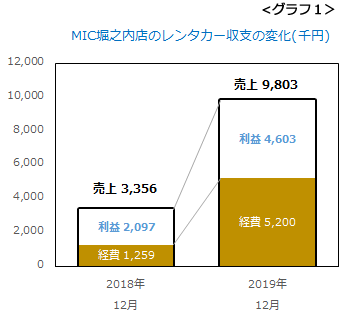 レンタカーは、経費の増加分以上に稼いでくれましたので、利益が倍増しました(グラフ1)。