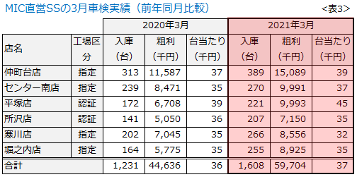 特に車検需要の高い3月は、その獲得に向けて年初からキャンペーンを実施してきました。おかげで既存6店で入庫1,608台、粗利5,970万円を得ることができました(表3)。