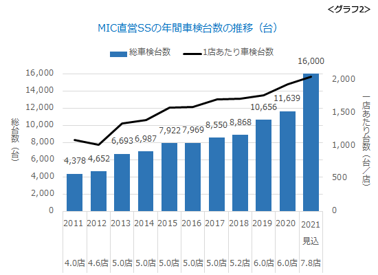 車検実績はこの10年間で3倍増。今年度は1万6,000台に達する見通しです(グラフ2)。