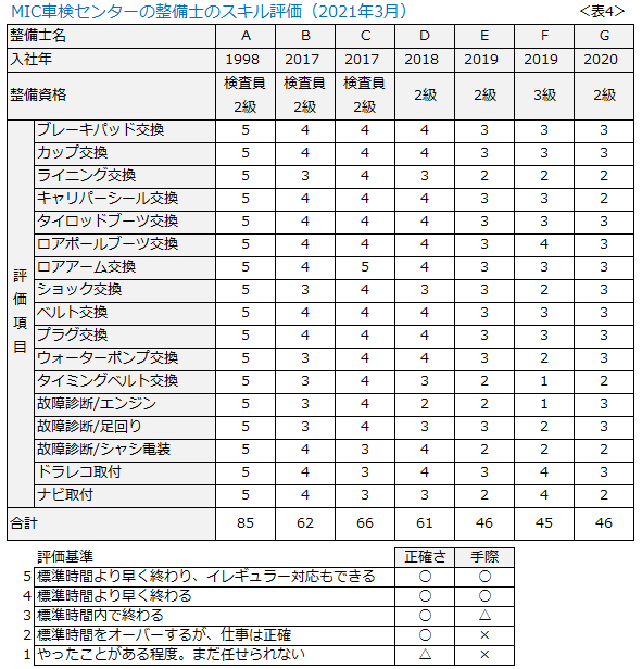 表4は、当社の「車検センター」の整備士のスキル一覧表です。まず「車検センター」について説明します。