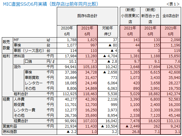 当社直営SSは、「営業利益の月間記録更新が、17ヵ月目で途絶えた」と先月号で述べたばかりですが、6月は、さらに悪化してしまいました。 既存6店の6月の営業利益は合計1,140万円。前年同月が2,200万円でしたから、半減です(表1)。