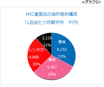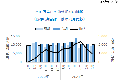 しかし、油外収益の伸びが鈍化しているのが気になります。昨年夏以降、中古車販売が活性化したおかげで、前年比1,000~2,000万円のレベルで伸び続けていましたが、1周りして、いよいよ伸び切ってしまったのでしょうか(グラフ1)。