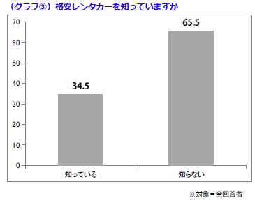 さて現在、一般ユーザーにどの程度知られているのでしょうか? 何と3分の1が、格安レンタカーサービスを「知っている」と回答しました(グラフ3)。