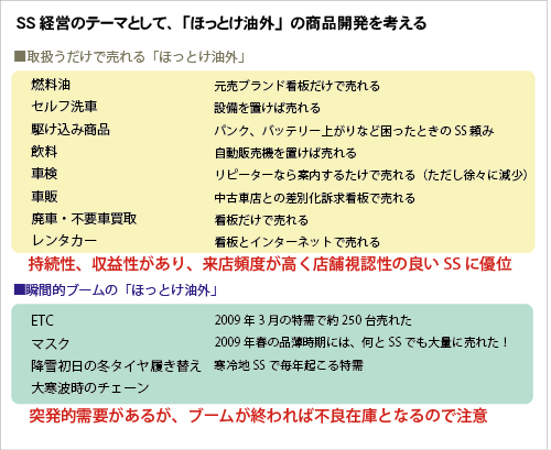 今回は、取り扱うだけで売れる「ほっとけ油外」商品のラインナップについて、さらに、顧客ニーズを顕在化すれば、「説得しなくても買ってくれる」お客様の識別方法について考えてみました。このふたつが「無理をしない」SS経営に寄与できるのではないかと思っています。