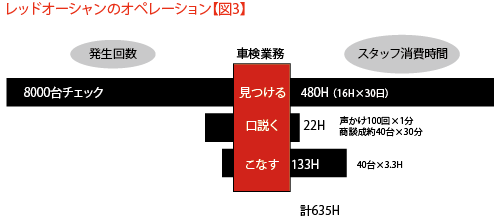 そして100台の対象客に対し、声かけ、商談、成約といった「口説く」作業を繰り返します。正しく実施すれば、だいたい40台の車検を獲得することができます。投入時間は約22時間。