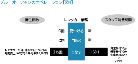 一方、「ブルー」の代表である中古車レンタカーでは、「見つける」「口説く」作業 は不要です。かりにレンタカー20台を保有し稼働率が50~60%程度であれば、「こなす」ために180時間の投入が必要なだけです。しかもそのスタッフ に専門技術は必要ありません。