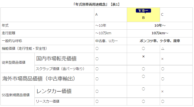 しかし1点の突破口がありました。 自動車市場は、新車市場と中古車市場があります。 中古車市場は、およそ「年式10年未満、走行距離10万km以下」の車に価値があるとされ、流通しています。したがってこの範囲に入らない「10年以上、 10km以上」の車は、「ポンコツ」と呼ばれ、スクラップ業者による部品取りと鉄屑としての価値しかありませんでした。