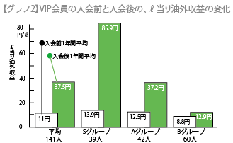 「グラフ2」は、「VIP会員」に入会した顧客の入会前1年間と入会後1年間の油外収益貢献額を比較したものです。