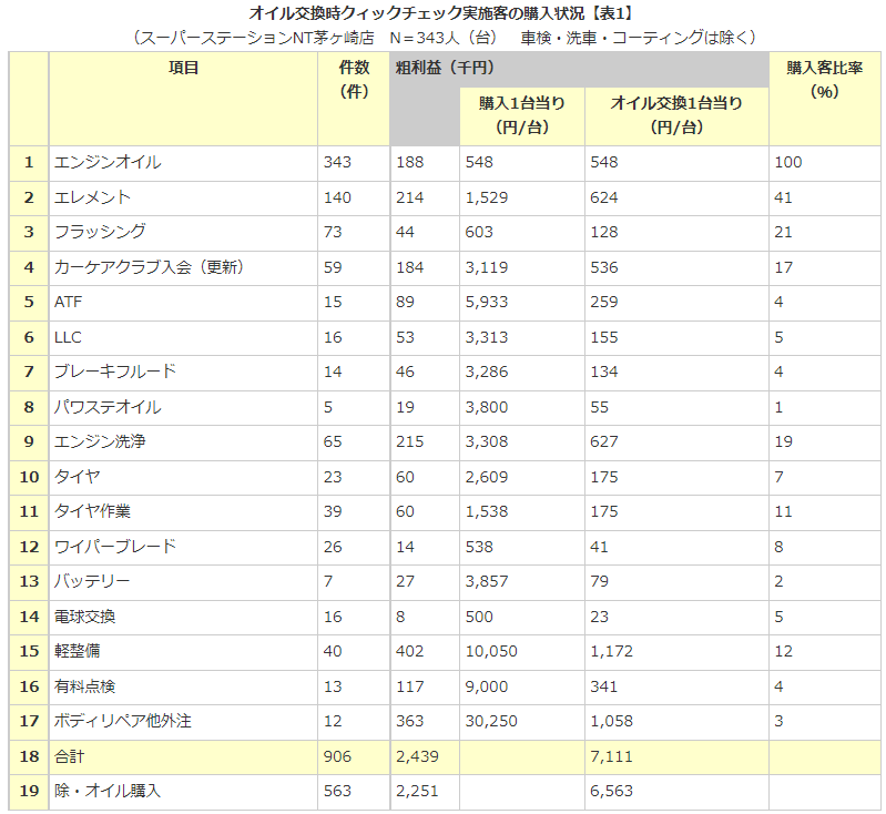 「表1」は、当社直営SSがオイル交換時に点検することにより「売れたもの」の一覧です。オイル交換当日に売れる場合もありますが、「時間」と「お金」を用意してもらい、後日注文していただくケースがほとんどです。