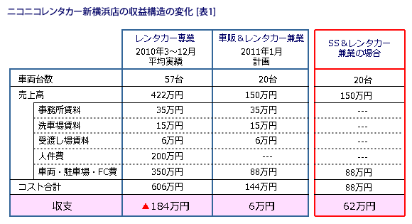 まず当社の「車販部隊」を新横浜店に移動し、車販とレンタカーを兼業します。これで人件費が車販ビジネスの埋没経費となります。