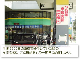 当社が最初に手掛けた店、第1号店が仲町台SSです。当時は1ベイで年間3,500台の車検を行いました。月に415台実施したこともあります。当時は"車検命"でしたから、手探り状態ながらも、告知・商品力・スタッフのモチベーシヨンアップに全精力を傾注しました。