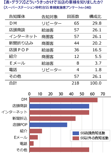 その結果、DM、インターネット、折り込みチラシなど、SS店頭以外の販促活動によって車検を実施していただいた方が過半数に達し、SS来店客に対するPOPやスタッフによる商談は3割程度でした(表・グラフ2)。