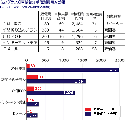 効果的な手立ては学び、やってみる。費用対効果が合えば文句はない筈です。(表・グラフ2)の告知方法には、それぞれにコストがかかっています。そこから得られる車検粗利を費用対効果とし(表・グラフ3)にまとめました。