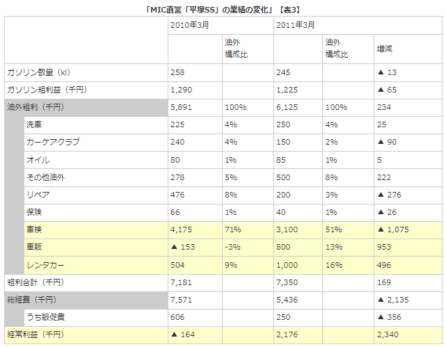(表3)は今年と昨年の3月の業績を対比したものです。経常利益は前年赤字でしたが、218万円に改善しました。ガソリン販売量は減少しましたが、油外粗利はやや増加しました。