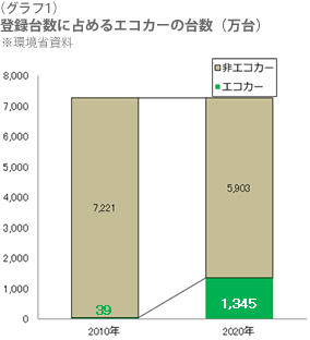 「エコカー」の普及による燃料油販売市場への影響が、そろそろ出てきているように思います。この夏は本当に暑い日が続きましたが、ガソリン価格は軟調でした。7~9月の3カ月間でL当たり10円前後も下落したのではないでしょうか。 これだけガソリン価格が安くなったにもかかわらず、県単位でも、二桁マイナスの割合でガソリンが減販する事態に陥っています。この事態については、「景気低迷による買い控え」だけが理由として説明できないように思えます。 環境省の資料によると、乗用車に占める「エコカー」の比率は、2020年に20%近くまで達するそうです(グラフ1)。しかし、国が予測する以上に高度な技術が開発されたり、製品の低価格化が早まるかもしれません。