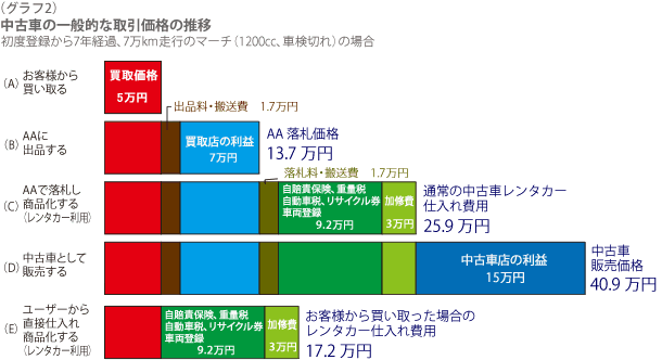 では、中古車レンタカー店が、自動車ユーザーから車を直接購入したらどうでしようか。 買取店や販売店、オークション会場などの中間利益はありませんから、仕入れて商品化するのに17.2万円のコスト負担で賄えます。