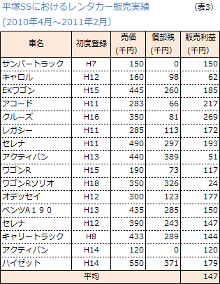 そこで車両の償却残高に、レンタカーとして向こう2~3カ月間運用すれば得られる利益の15万円ほどを上乗せした価格で販売しています(表3)。